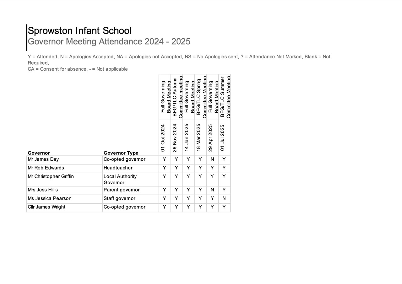 The governing body holds one full governing body meeting each term and one committee meeting each term. There are two committees: ‘Building, finance and grounds’ and ‘Teaching, learning and curriculum’, which meet together.
